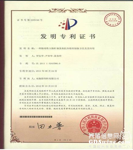2012年10月3日,中华人民共和国国家知识产权局向双胞胎集团再次颁发发明专利证书,对集团研发中心申报的《一种肠毒性大肠杆菌蛋黄抗体粉的制备方法及其应用》授予国家发明专利。