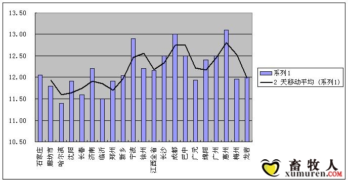 目前宁波、成都、惠州、长沙、巴中价格依然维持在12.5元/公斤之上,领先于其他监测地区,而哈尔滨和临沂价格已经跌至11.5元/公斤下方,今日长春市价格较昨日有所回升并且再次回归11.5元/公斤上方,而其他地区均保持在11.5-12.5元/公斤之间。