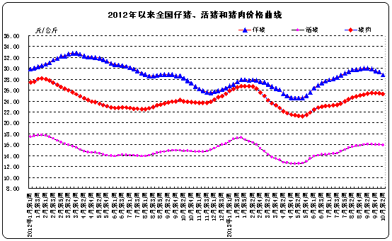 生猪价格。全国活猪平均价格15.93元/公斤,比上周下降0.4%,与去年同期相比上涨6.8%。活猪价格上涨省份8个,下降省份21个,持平省份1个。西北地区活猪平均价格较高,为16.65元/公斤;华南地区较低,为15.29元/公斤。全国仔猪平均价格28.79元/公斤,比上周下降1.8%,同比上涨2.2%。仔猪价格上涨省份6个,下降省份24个。全国猪肉平均价格25.30元/公斤,比上周下降0.6%,同比上涨5.5%。猪肉价格上涨省份6个,下降省份22个,持平省份2个。西北地区猪肉平均价格较高,为26.66元/公斤;华南地区较低,为23.65元/公斤。
