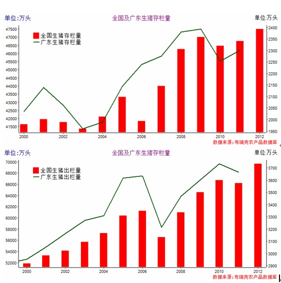 一、饲料产量情况 按照广东省饲料工作办公室发布的数据,2012年广东饲料产量为2332万吨,约占全国饲料产量1.94亿吨的12%,已经连续9年位居全国第一。其中水产饲料占全国产量22.3%,达到422万吨;猪料占全国产量的12.3%,达到950万吨;肉禽料占全国产量的14.3%,达到790万吨;蛋禽料产量151万吨,主要是广东地区气温偏高,空气潮湿,不适于规模化养殖蛋禽;反刍料产量较少,仅有1.9万吨。 二、畜禽存栏及出栏情况 2.1 生猪业发展情况 2012年全国生猪年末存栏量为4.75亿头,广东为2256万头,占全国的4.68%。全国生猪出栏量为6.963亿头,广东为3736万头,占当年全国出栏量的5.36%。出栏占全国比重大于存栏比重,较大程度反映出广东地区生猪养殖水平高于全国平均水产,这主要得益于广东生猪标准化规模养殖走在全国前列。 另外,2012年末全国能繁母猪存栏5068万头,广东能繁母猪存栏量为250万头。 2.2 家禽业发展情况 广东是家禽生产和消费大省,2012年出栏家禽11.3亿只,占全国10%,排名第二。其中黄羽肉鸡、水禽、肉鸽等产量排名全国第一,出栏量分别为7亿、2.7亿和1亿多。年末存栏家禽3.6亿只。 2012年广东蛋鸡存栏量为2834万只,鸡蛋产量18.7万吨,占广东禽蛋产量(31.8万吨)的58.8%。据国家统计局公布数据显示,2012年中国禽蛋产量为2860万吨左右,其中鸡蛋产量约为2320万吨。 2.3 水产业发展情况 据广东省海洋与渔业环境监测中心统计,2012广东省养殖用海面积145017ha,深水网箱684394m3水体。围海养殖是最主要的养殖类型,面积74229 ha。其次分别是底播养殖、伐式养殖和吊笼养殖,面积分别为40863 ha、13223 ha、9395 ha。 2012年广东省水产品产量793.15万吨,同比增长4.1%。其中,海洋捕捞产量152.61万吨,增长0.2%;海水养殖产量278.63万吨,增长4.9%;淡水捕捞产量12.86万吨,增长0.2%;淡水养殖产量349.05万吨,增长5.3%。 三、饲料原料需求推算 一般情况下,能量原料及蛋白原料是全价料构成的主要部分,其价格直接影响饲料成本。能量原料主要为玉米和小麦,蛋白原料包括豆粕、菜粕、棉粕、花生粕、DDGS、鱼粉、玉米蛋白粉等蛋白原料。 3.1 能量原料需求情况 从多种渠道了解的数据,考虑上自配料的使用部分,2012年玉米需求估计为1100万吨。由于去年小麦与玉米价格倒挂,广东饲料企业在畜禽料中大量使用小麦替代玉米,导致小麦需求激增,加上水产饲料中的使用量,估计去年小麦需求约260万吨。同时,广东地区在冬季会使用一定数量的木薯干替代玉米,这个量在20万-30万吨。 2013年,由于爆发H7N9流感,家禽养殖受挫,水产料方面因天气因素需求下降,但由于猪料需求较好,全年广东地区工业饲料产量仍有望小幅增长,预计可达到2350万吨。结合养殖户自配料情况,预计2013能量原料需求量为1350万吨。其中玉米在1230万吨左右,小麦100万吨。随着6月份后蛋白原料价格上涨,小麦替代再次出现机会。木薯干需求量在20万吨。如果从存栏情况来看,生猪对能量原料需求在730万吨左右,而禽类在420万吨左右。 3.2 蛋白原料需求情况 2012年广东工业饲料纯蛋白总需求量为435万吨,剔除能量原料及其他原料蛋白提供量,这个数应为280万吨,折算标准豆粕为650万吨。考虑到养殖户自配料因素,2012年广东饲料纯蛋白需求量为308万吨,折算标准豆粕为715万吨。 当前广东一年大豆压榨量为700万-720万吨,可提供的豆粕量为560-575万吨。缺口部分由菜粕、棉粕、DDGS、玉米蛋白粉、鱼粉、花生粕提供。广东是国内主要的菜籽进口省份,DDGS和鱼粉进口量也位居全国前列,棉粕主要外省调运,正常情况下蛋白原料供应是有保障的。 2012年末杂粕价格优势明显,饲料企业大量使用。但是,进入2013年,由于产量和进口减少,6月末后杂粕价格大幅上涨,甚至出现了豆粕在水产料和禽料方面替代杂粕情况,也加剧了豆粕供应偏紧局面。另外,由于今年一季度末市场普遍认为后期饲料需求下降,事实并非如此,在巴西2-4月份港口堵塞因素递延作用下,造成6月末蛋白原料供应紧张局面,价格因此大幅上涨。 四、饲料及养殖市场展望 随着国内人口红利消失,四川、湖南等内陆省份的生猪养殖成本增幅明显高于广东地区,主要表现为人工成本和饲料成本上涨。另外,广东从粤西至粤东均有大型海港,可从东北、华北、国外进口饲料原料,珠江流域的众多内陆码头还可停靠1000吨以上船只,为广东饲料原料运输提供了良好条件,有利于降低运输、采购成本。而且,广东拥有广阔的消费市场。 按照中国工程院的研究报告,在人口持续增长、城镇化进程加快及人均收入增加等因素的驱动下,全国养殖产品消费需求快速增长,2030年之前养殖业都将处于高速发展时期。到2020年和2030年,中国养殖业产值占农业总产值(种植业和养殖业产值之和)比重,将分别达到约52%和55%。广东作为全国的饲料大省、养殖大省,养殖业的发展虽然正遭到土地、环保等因素制约,但胜在标准化、集约化水平较高,未来的发展依然值得期待。 广东养殖业快速健康发展有利于促进饲料业内部结构调整和优化,拓展农业经济增长新渠道、增加农民就业机会和提高农民收入。因此,广东饲料市场并未出现明显产能过剩。如果出现过剩,仅是因为产品无法适应当前的市场,出现滞销罢了。 未来,广东养殖业将逐步从城市向农村转移,从小散脏乱向标准化、规模化、机械化、生态化方向推进。广东饲料业将呈现出类似的产业转移、转型的