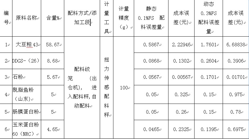 表1是一个猪浓缩饲料配方。这个配方由18种原料组成,其中大豆粕(CP43%)的含量为58.67%。在生产过程中,如果其配料精度是0.1%FS,那么就会造成2.22946元/t的成本误差,这种隐性误差基本会因为生产习惯而随着产量的提升成正比扩大。在实际生产过程中,配料误差要远远大于0.1%FS,尤其是对于人工配料、手动机械配料或管理不完善的企业来说,因配料误差不能控制在标准范围之内而给企业带来的隐性成本差异是无法估量的,对于规模化饲料企业来说,控制配料误差更是具有深远的意义。