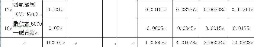 在表1的配方设计中,需要在配料秤上添加的原料品种一共有8个,除大豆粕外,其他原料都会因添加量过少而达不到配料精度;而且需要人工配料与添加的原料品种达10个之多,大大影响了生产速度。其中,蛋氨酸钙(DL-Met)的添加比例为0.101%。如果使用1 000kg的混合机生产,那么其批次添加量为1.01kg,这就要求所使用的配料秤精度必须在10g以下,而且在进入混合机之前必须经过预混合。显然,这样的配方设计不仅增加了配料精度超出允许值的机率,而且降低了生产效率。因此,在进行配方设计时,必须要依据生产工艺与设备状况来考虑各种原料的添加量是否便于生产的实际操作、是否符合本厂的生产方式。