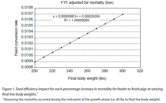 | 既然饲料效率受诸多因素影响,而这些因素又都是变化的,故计算饲料效率的方法也不可能一成不变。最近几年,日粮的能量水平、断奶年龄、上市重、饲料加工技术等方面均发现了显著变化。由于饲料成本的增加,过去几年里猪日粮能量水平已显著下降;断奶日龄也有所提高,旨在提高生长性能及成活率;肉猪的上市体重也呈上升趋势,因为提高的上市体重带来的经济效益大于其所需要的生产成本。为了提高饲料效率,人们还致力于研究饲料加工技术,已经发现加工方法可影响饲料效率。总之,这些变化均解释了当今养猪业生产、经济记录的变化,例如饲料效率度量指标。因此,尝试解释这些变化使生产、经济数据更有意义显得尤为重要。 一、校正肉猪的始重、末重 我们知道日粮能量水平、肉猪的始重和末重、饲料是否深加工均对饲料效率有影响。因此,校正因素可以用来评估这些因素的影响,计算公式如下(Goodband等, 2008)。其中,将始重用50磅、末重用250磅进行校正。0.005表示饲喂添加约5%油脂的玉米-豆粕型日粮以活体重为基础计算的饲料效率的斜率。 校正的F:G=观察到的F:G+(50-始重)×0.005+(250-上市末重)×0.005 (公式1) 表2利用了上述公式来计算饲料效率。数据显示:不对始重、末重进行校正时,生长育肥群1和生长育肥群2的饲料转换率(G:F)相似,分别为0.352、0.350。但校正后,群1的G:F比群2的提高了5.05%。这是因为群1的肉重始重、末重均高于群2。由此可见,肉猪的始重、末重对饲料效率计算的影响。 二、校正谷物来源、油脂水平、制粒加工 进一步的校正可以解释谷物来源、油脂水平、制粒加工对饲料效率的影响,公式如下(Goodband等, 2008)。猪对不同谷物的利用率不同,为玉米时谷物因子为1、为蜀黍时谷物因子为1.02、为大麦时谷物因子为1.18、为小麦时谷物因子为1.07。公式中认为油脂每添加1%,饲料效率可提高2%。现在普遍认为制粒也可一定程度上提高饲料效率,提高率一般为4%-6%。 三、校正肉猪的始重、末重、能量水平 如公式1中体重校正方法一样,始重用50磅、末重用250磅进行校正。能量的校正方法不同。需注意的是公式中0.005受日粮、能量变化影响。 校正的F:G=观察到的F:G+(50-始重)×0.005+(250-上市末重)×0.005- 【(1600-能量水平)/1600】×观察到的F:G (公式3) 下表Box1演示了用公式3如何计算饲料效率。 四、考虑死亡率对饲料效率的影响 营养学家们认为还应该考虑死亡率对饲料效率的影响,尤其是当高死亡率发生时。当进行这种类型的校正时,需掌握死亡率每增加1%对饲料效率的影响。图1假设死亡发生在60磅至上市末重阶段,解释了不同末重对饲料效率的影响。当死亡率每增加1%时,不同上市末重对饲料效率的影响不同,末重越大饲料效率越低。 下表3演示了校正死亡率后的饲料效率。生长育肥群1和群2死亡率分别为4.9%、3.7%,不考虑死亡率的情况下,校正后G:F分别为0.376、0.357。当对死亡率进行校正时,校正后G:F分别为0.382、0.361,分别比校正前提高了1.6%、1.1%。 想要了解更多养猪、饲料等专业知识,请持续关注畜牧人网站,给您带来不一样的感受! 畜牧人网站:http://www.xumuren.com/ |