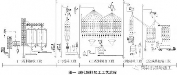 | 0 引言 随着饲料业市场竞争不断加大,饲料品质已成为饲料企业发展管理的基础和保有市场竞争力重要保障。传统靠一张饲料配方和几把铁锹打遍天下的饲料加工模式早已不复存在,规模化、集团化饲料企业已基本发展成熟,在传统加工模式没有保障的饲料品质,已成为市场竞争的主要对象,也是规模化、集团化饲料企业发展管理的基础及保障。饲料品质主要集中在饲料原料、饲料配方、饲料加工生产3个环节得以把控,规模化、集团化的饲料企业有利于这3个环节的统一管理控制。其中,饲料加工是将饲料原料按照饲料配方经过设计好的加工工艺及其装备加工成为成品饲料的过程,在把控好饲料原料及饲料配方的同时,饲料加工中的加工工艺设计及装备选择就成为保证饲料品质关键环节。现代饲料加工工艺及其装备主要由原料接收工段、粉碎工段、配料混合工段、制粒工段、成品包装工段等几部分组成,如图1所示。 本文将从这5个工段讲述现代饲料加工工艺及其装备的研究分析,通过每个工段的工艺及相关装备的讲述,介绍现代饲料加工工艺设计及装备选择的总体方向及提高饲料品质的关键措施。 1 原料接收工段 原料进厂接收是饲料企业饲料生产的第一个工段,也是保证生产连续性和产品质量的重要工段。中小型饲料企业的原料接收一般都是库房式分类接收。大型饲料企业库房式接收不仅需要大面积库房,增大厂房车间面积,而且原料分类保存等管理难度也非常大,原料库房间运输成本也非常高。 现代饲料加工工艺原料接收工段一般采用立筒仓工艺(图2)对原料中需求量大的大宗料(如玉米、小麦)进行接收管理。立筒仓工艺一般由钢板仓、输送设备、处理设备等组成。装备式螺旋钢板仓是目前大型饲料企业原料接收工段主要选择,具有安装方便、承载能力强、造价成本低及使用寿命长等优点。钢板仓内配有测温、测空、测满及通风设备,方便对仓内物料的监控管理;提升机、清理筛、除尘设备、刮板等工艺设备不仅很好的完成了物料进仓输送及杂物、铁屑的预处理,而且通过刮板输送把立筒仓工艺与生产加工车间完成对接。 原料的品质管理已成为大型饲料企业的管理重点,也是保证成品饲料品质的关键点,只有好的原料品质才能合理有效的加工成为高品质饲料。目前,大型饲料企业对于大宗料普遍采用立筒仓保管,利用 立筒仓保存的优点能有效保证大宗料的品质,对于辅 料及小料的保存一般采用专人管理及专门库房(空调 房等)保存。 2 粉碎工段 粉碎工段主要是对颗粒原料及粗粉料进行粉碎工作,工艺一般包括清理筛、永磁筒、待粉碎仓、粉碎机、风网等,粉碎产量和粉碎后物料的粒度是重要的生产指标。饲料企业大宗原料(如玉米、小麦、豆粕)等都需要进行粉碎,粉碎工作量非常大;同时为了提高饲料成品饲喂营养价值,原料粉碎的粒度要求越来越细(如:猪饲料玉米粉碎筛孔为φ1.5左右,膨化豆粕粉碎筛孔为φ0.8左右)。为此,粉碎工段中粉 碎机的选择及辅助粉碎风网的配置是两个重要的工艺设计指标。一般根据原料粉碎工作量及粉碎粒度要求来选择粉碎机功率大小及粉碎机系列的选择,对于粉碎工作量大及粉碎粒度细的粉碎工作可以选择超越微粉碎机,如牧羊第三代超越微粉碎机,其功率大、粉碎效率高、能耗低,进口处配备了喂料器,增大了进料的均匀性,有助于粉碎效率的提高;同时粉碎风网设计为刹克龙加脉冲的组合风网配置,此配置先通过刹克龙进行粉尘降尘,再经过脉冲除尘,这样配置能有效降低粉尘对脉冲布袋除尘效率,同时能增大粉碎风量,足够的粉碎风量就能对粉碎机的粉碎室形成足够的负压,只有足够的粉碎负压粉碎机粉碎效率及粒度要求才能很好的发挥出来。 粉碎粒度的粗细也是提高饲料品质的关键之一,粉碎粒度越细,越能体现原料物质本身的属性,通过后面工段加工更能得到高品质饲料,提高动物吸 收营养价值、适口性等优点。为此,饲料企业为提 高饲料品质,在粉碎工艺设计及粉碎机设备选择上要求越来越高,投入也越来越大,目的就是为了提 高原料粉碎的细度。 3 配料混合工段 配料混合工段是将准备好的饲料原料通过混合机按照饲料配方比例进行搅拌混合,工艺包括:待配料仓、配料秤、小料添加设备、液态原料添加设备、混合机等。待配料仓根据原料品种数量由12~20个仓群组成,并且为了避免原料交叉存放,目前配料仓按照每种原料的需要量设计至少1~2个独立仓存放。配料秤可以根据待配料仓数量的多少及配料速度是否满足混合机配料需求设计1~2个配料秤。小料添加设备是对于量少及贵重原料(如微量元素)、腐蚀性原料(如食盐等)直接从小料投料口投到混合机进行搅拌混合。液态原料添加设备是对于饲料配方中需求的油脂、水等液态原料进行添加的工艺,传统液态原料添加一般是直接投入到混合机或者应用简易油桶设备进行添加,目前液态原料添加都是设计成自动加热称重式的液态原料添加设备系统,可根据配方需求自动完成对油脂的加热、称重、投入到混合机一系列工作。混合机是配料混合工段的核心设备,主要完成饲料原料配完料后的搅拌混合工作,混合时间及混合均匀度是考核混合机设备性能好坏的两个重要指标。目前混合机的选择从传统技术落后的螺带混合机转变为双轴桨叶式的高效混合机,它的混