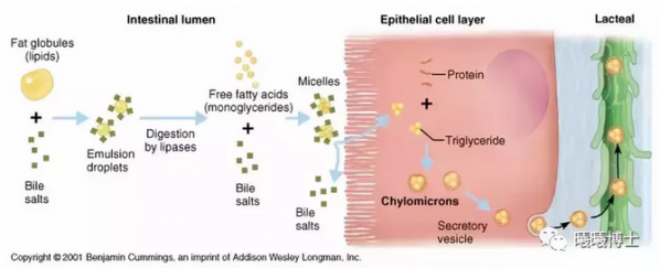脂类的消化与吸收,看这一篇就够了 作者:Xixi博士 转自:曦曦博士微信公众号 继《单胃动物如何消化和吸收蛋白质?看这一篇就够了》之后,动物营养101小讲堂又回归啦。这一次,我们来聊聊脂类。 1、什么是脂类? 说到脂类 (lipids),你会想到什么呢?肥肉?油腻?减减减?…好像都是不好的联想呢。事实上,脂类在动物和人的正常生理活动中起着至关重要的作用。不说别的,单看含量,成年动物的体脂率就至少在10-20%以上。 一只100kg的猪,其体脂含量甚至高达36%。 这么多的脂类在身体里,都干啥用?没错,它们的主要功能是为动物提供和贮存能量 (愁人的游泳圈哎)—— 这是因为它们的能量价值极高,同等重量下,其能量含量约是蛋白质和碳水化合物的2.25倍。在生存第一的本能下,动物自然要尽可能高效地贮存能量,以防哪天饿死。但脂类的作用远远不止与此,它们还扮演着极其重要的「结构性功能」(比如每一个细胞的细胞膜组成都离不开磷脂和糖脂)和「营养生理功能」(比如作为脂溶性营养素的溶剂、必需脂肪酸的来源、激素的合成、机体的防护和绝热作用等等等等)。因此脂类对机体代谢起着关键作用,在动物的营养和生命过程中不可或缺。 细胞膜的双层磷脂结构 2、脂类的分类 「脂类」其实是一大堆化学组成各异的分子的统称。它们的共同特性是不溶于水而溶于有机溶剂中。从简到繁,脂类可以分为脂肪酸、脂肪、和类脂这三类。 脂肪酸(fatty acids)是最简单的一种脂,也是其它脂类的基本组成成分。脂肪酸本身也是一个种类繁多的家族 —— 根据碳链长度,可划分为短链、中链、和长链脂肪酸; 根据饱和程度(是否有双键结构&有几个),可划分为饱和脂肪酸、单不饱和脂肪酸、和多不饱和脂肪酸; 根据动物是否能够自己合成来满足需求,又可分为必需脂肪酸和非必需脂肪酸,其中必需脂肪酸(Essential fatty acids, 简称EFA)必须从饲料中供给。亚油酸、α-亚麻油酸和花生四烯酸这三种脂肪酸便是大多数动物的EFA; 前两者亦是人的EFA。 注意到了吗,前面我一直在说脂类而不是脂肪 --- 这是因为脂肪(fats)只是脂类中的一类而已。脂肪的学术名为甘油三酯(triglycerides),是一类由1个甘油和3个脂肪酸组成的分子。甘油就像一个骨架,上面挂着3条脂肪酸尾巴。根据脂肪酸的不同,甘油三酯的结构也千变万化。 而类脂则是结构更为复杂的脂类的统称,所以又称复合脂类 (complex lipids), 它包括了磷脂 、鞘脂 、糖脂、脂蛋白、以及固醇类。被人们熟知的卵磷脂(lecithin)就是磷脂中的一种;而动物维持繁殖性能的雄激素、雌激素、孕激素则都属于固醇类。 甘油三酯(脂肪)和磷脂的结构示意图 3、脂类的消化 在现代的动物生产中,饲料中都会添加一定量的脂类,主要为动物或植物来源的脂肪, 同时含有少量的磷脂和固醇。前面讲到,脂类的能量价值高,因此它作为能量来源可有效地提高生产性能。同时,脂肪的适口性好,动物爱吃,还能够适当延长食糜在消化道的时间,因此能够一定程度地促进其它营养物质的消化吸收,使饲料中可被动物利用的能力提高。这种效应也被称为脂肪的「额外能量效应」。 那么,吃进嘴里的脂类,动物如何将之消化吸收呢? 在《动物营养101 | 单胃vs. 反刍, 不同动物的消化生理有何异同?》这篇文章里,我们曾详细讲过消化的三种方式 —— 其中物理消化太简单粗暴,微生物消化又太复杂多变,这里我们主要聊聊各动物间比较一致的「化学消化」。 化学消化,顾名思义就是通过酶的作用而将营养物质水解成可吸收的小分子。动物的口腔和胃中,的确存在脂肪酶,但对日粮中的脂类的消化作用甚小,可以忽略不计。这里有个例外 —— 初生小动物在肝脏和胰腺功能还未发育健全之前,口腔内的脂肪酶对奶中的脂类具有较好的消化作用。然而随着年龄的增长,口腔内的脂肪酶分泌就会减少。 当脂类进入十二指肠时,它便与大量的胰脂肪酶和胆汁混合。其中,胆汁(bile)由肝脏分泌,平时乖乖储存在胆囊里。当胆囊发现主人进食后,便会将胆汁大量排入小肠。胆汁本身并不是酶,而是一个含有水分、无机成分(钠|钾|钙等)、和有机成分(胆盐|脂肪酸|磷脂|胆固醇等)的混合液体。那么它的作用是啥?它的角色,便是胰脂肪酶的最佳拍档。 我们知道,脂类不溶于水,但酶促反应需要水的参与。这时,胆汁中的这些有机成分便可作为乳化剂,来“伪装”脂类,使其亲水。具体来说,胆汁中的明星队员「胆盐」它一端溶于水,一端溶于油,因此在与脂肪接触时,能够将亲油的那一端插入脂肪中,将大块脂肪撬开成一颗颗小油滴,而亲水那一端则在外围包裹住油滴,使它能够融入水里。这个原理,其实就跟肥皂能洗掉衣服上的油脂是一样的。#看到知乎上的一个网友评论:分子的世界真是肤浅,脂肪穿了个马甲,就以为它亲水了。哈哈哈 胆盐对脂肪的乳化作用 胆盐的这一步工作使得脂肪与酶的接触面积增加,同时也激活脂肪酶,使其能够发挥作用,最终将甘油三酯分解成为2个游离脂肪酸 + 1个甘油一酯(只有极少数的甘油三酯能甩掉三个脂肪酸尾巴)。与此同时,摄入的磷脂和固醇类也会被相应的酶水解成脂肪酸、溶血性卵磷脂、和胆固醇。所以,脂类在小肠中的消化产物是一个复杂的混合体。 甘油三酯水解为2个游离脂肪酸+1个甘油一酯 4、脂类的吸收 接下来,这些复杂的消化产物就准备好被吸收啦。可