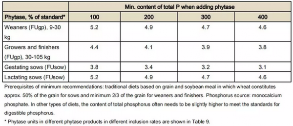 营养需要标准 丹麦营养标准第26版 机构:SEGES猪研究中心 作者:PER TYBIRK, NIELS MORTEN SLOTH, NIELS KJELDSEN AND LISBETH SHOOTER 更新日期:2017年10月26日[url=]B[/url] 丹麦饲料评估系统 丹麦饲料评估系统,于2002年修订,是基于营养的生理能值和营养的标准消化率。2002年,旧的饲料单位被两个新饲料单位取代: FUgp(该单位针对断奶仔猪、保育猪和肥猪)和 FUsow(该单位针对母猪)。 在实践中,丹麦能量评估基于以下几点: 1.水分、灰分、粗蛋白和粗脂肪的化学分析 2.回肠水平和粪便水平的体外消化率 3.基于“潜在生理值”的营养能量值 基于每种氨基酸在回肠标准消化率的蛋白质评估系统 氨基酸 氨基酸标准见表1-4,注意边界值不包括在内。断奶仔猪、保育猪和肥猪的标准是建立在自由采食或是接近自由采食的条件下的。在泌乳高峰期(12-28天)饲喂7FUsow单位(最低饲喂量)时,哺乳母猪与高产母猪标准相一致。后备母猪的标准是建立在限饲基础上的,其目的是在其约8月龄、体重135-150kg的时,后备母猪在第二次发情时能够正常受精。按照怀孕母猪的饲喂标准来饲喂公猪,能满足公猪生产精子所需氨基酸的需求。这些标准的建立是基于经济上最优化的考量,如果基于生产力最高设定标准,增加的饲料成本会超过生产率提高带来的效益。后备母猪的标准是基于达到每日最大增重(约725g)的标准。 表1,2,3和4显示了猪饲料中最低的粗蛋白质水平。最低水平可防止饲料配方的不准确性。此外,表1还提供了断奶仔猪饲料中最高可消化蛋白的水平的限制,以确保仔猪有效利用蛋白质,因为高蛋白质可能增加腹泻暴发的风险。 表1断奶仔猪的氨基酸标准,每个饲料单位(FUgp)可消化氨基酸g。 如果赖氨酸水平/体重范围不同于上表,必须确保理想蛋白质的氨基酸组成得到满足 氨基酸标准呈现出这种水平:在正常的氨基酸价格条件下,确保猪群的正常、健康,获得最大毛利率。研究表明,将赖氨酸标准提高7-10%可获得最大生产力【对应于11.8(6-9kg)和11.6(9-30kg)g标准的可消化赖氨酸,每个饲料单位包括上述所有必需氨基酸】。预计这将提高FCR和日增重1-2%。研究还表明,当色氨酸标准从当前约为赖氨酸标准的21%-22%增加到对应的超过表中规定的约0.21克可消化的色氨酸水平时,可获得最大生产力。 表2生长猪和育肥猪的氨基酸标准,每个饲料单位(FUgp)可消化氨基酸g。 表中在30-110kg猪的饲料转化率标准(每kg应该吸收2.75FUgp)。饲料转化率在2.66-2.75FUgp/kg之间的30—110kg时期的猪群,建议生产者将所有体重范围猪的氨基酸的标准提高2.5%。饲料转化率超过2.65FUgp的猪群,建议生产者将所有氨基酸标准提高5%。生产者如果关注高瘦肉率的特殊生产目的,比如为满足英国市场,建议在所有猪日粮中增加可消化的粗蛋白含量5g/FUgp,直到屠宰,如果进行阶段饲喂的话,该标准不适用于65kg以下的猪。表2a显示了根据FCR和猪价格模式的组合标准。 建议应用这套标准和总则(赖氨酸%)应与实际中的体重范围相适应。 表2a根据英国市场的FCR和产品而制定的30-110kg猪的营养标准,每个饲料单位可消化的g数(g/FUgp)。 表2中剩余的必需氨基酸含量与总(赖氨酸%)在30-110kg体重范围的相匹配。 表3后备母猪的氨基酸标准,每个饲料单位可消化的g数(g/FUgp). *不低于65kg的后备母猪提供最严格的饲喂方案。总氨基酸要显著低于最大需要量,目的是减缓增长速度并延长育肥从而获得更长的使用寿命。氨基酸标准是基于实际评估从而确保后备母猪的日粮也可用于其他类别的猪。如果只使用后备母猪日粮到110kg,相反,你可能要参照如表2所示的体重在75-110kg肥猪的氨基酸标准(赖氨酸%)。 表4母猪的氨基酸标准,每个饲料单位可消化的g数(g/FUgp). 从断奶到授精的空怀母猪 矿物质 矿物质标准以猪的需求和安全边界表示,一般不建议猪生产者添加超过标准的矿物质,这特别适用于钙,因为钙与某些微量矿物质相互作用,因此高含量的钙可抑制这些微量矿物质的吸收。 可消化磷标准是最低标准,因此不包括安全边界。 表5,6和7中的矿物标准以饲料中的总量表示。 公猪饲料参照育肥猪的矿物质标准,直到100kg;100kg 以上公猪依照妊娠母猪的标准。 表5母猪和后备母猪的矿物质标准,每个饲料单位的总量. 1)根据丹麦饲料法规定,每千克全价日粮中不得含有超过0.5毫克的硒。根据日粮组成,这意味着允许每个饲料单位添加0.2-0.35mg硒。 表6断奶仔猪的矿物质标准,每个饲料单位的总量。 1)铁的最小值。100mg易溶铁盐。 2)根据丹麦饲料法相关规定,每千克全价日粮中不得含有超过0.5mg的硒。根据日粮组成,这意味着它允许每个饲料单位添加0.2-0.35mg硒。 3)当应用高含量的氧化锌时(2500ppm的锌),建议每个饲料单位比原标准额外添加0.3克可消化磷,当添加额外的锌时,同时建议在断奶仔猪饲料中添加植酸酶。 表7保育猪、育肥猪的矿物质标准,每个饲料单位的总量. 1)根据丹麦饲料法相关规定,每千克全价日粮中不得含有超过0.5mg的硒。根据日粮组成,这意味着它允许每个饲料单位添加0.2-0.35mg硒。 2)建议每个饲料单位添加70mg锌,以符合每个饲料单位100mg的标准,并且避免超过每公斤120mg的最大限量。如果确定饲料中含有最低限量200%的植酸酶,那么添加的锌可能要降低到每个饲料单位40mg。 由于不可能去分析饲料中可消化磷的含量,因此必须根据磷的总含量进行评估。表8列出了含植酸酶日粮中最低含