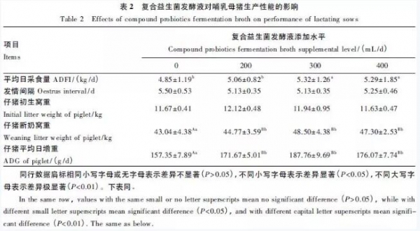导读 哺乳母猪的营养状况关系到后代的生长及免疫性能以及其本身的种用期。抗生素和化学药物的滥用不仅杀死了动物体内的致病菌,有益菌也同样被消灭,致使母猪肠道处于亚健康状态。因此,哺乳母猪的营养及肠道健康在生产中变的极为重要。乳酸菌和酵母菌是存在于动物体内的益生菌,有助于肠道健康,在防止消化道疾病产生的同时还能促进生长。以有益菌为主要原料配合成的微生态制剂在猪生产中已有相关研究。尹清强等研究表明,在哺乳仔猪和断奶仔猪饲粮中分别加入0.10%和0.05%微生态制剂能让仔猪胃肠道微生物区系维持稳定,显著降低仔猪的腹泻率和死亡率,且效果优于抗生素。陈兴荣等研究表明,在哺乳母猪、哺乳仔猪饲粮中添加微生态制剂能够提高哺乳母猪哺乳期的平均采食量,降低便秘发生率;能够提高哺乳仔猪的日增重、成活率。楚青惠等研究表明,对于妊娠后期和哺乳期母猪来说,每天每头饲喂250~300mL乳酸菌液对其生长性能、健康状况、血清抗氧化指标、粪便微生物数量等的改善效果较好。哺乳母猪是养猪生产中的重要环节,而有益菌在畜禽和仔猪上的应用较母猪多,且对哺乳母猪生产性能的影响方式和适宜添加水平还有待研究。因此,本试验将复合益生菌发酵液与湿拌料混合饲喂哺乳母猪,研究其对哺乳母猪生产性能、血清生化及免疫指标的影响,为有益菌在母猪生产中的合理应用提供依据。 1、材料与方法 1.1 试验材料 复合益生菌发酵液: 益生菌粉购于深圳某公司,其主要成分为乳酸菌和酵母菌及其代谢产物,复合益生菌发酵液是用该公司研发的自动发酵罐发酵系统发酵24 h 制备而成。复合益生菌发酵液的pH 是3.59,每毫升含乳酸菌1.0×108 CFU,酵母菌8×107 CFU。 1.2 试验动物及饲粮 试验母猪均从河南省鹿邑县天种猪场选取,为平均体重、预产期和健康状况都相近的2胎长白母猪。试验从母猪妊娠108 d 开始,至哺乳21 d时结束。参照NRC ( 2012) 母猪营养需要配制妊娠后期和哺乳期基础饲粮,其组成及营养水平见表1。 1.3 试验设计 试验母猪于预产期前7 d 转入产房,饲养于同一栋双列式产房,由同一饲养员看管,单栏饲养,漏缝式高床,有自动饮水器和铁料槽。圈舍通风良好,舍内保持清洁干燥,环境温度保持在20 ~25 ℃。试验母猪共60 头,随机分配到4 个组,每组15 个重复,每个重复1 头母猪。饲喂母猪时,在基础饲粮中添入适量的水,以湿拌料的方式饲喂,需要添加发酵液的母猪按剂量倒入湿拌料中。其中,对照组仅饲喂湿拌料,试验Ⅰ组在湿拌料里添加200 mL /d 的发酵液,试验Ⅱ组在湿拌料里添加300 mL /d 的发酵液,试验Ⅲ组在母猪湿拌料里添加400 mL /d 的发酵液。产前7 ~ 4 d 饲喂2 ~3 kg /d,产前3 ~ 1 d 饲喂1 ~ 2 kg /d,分娩当天不喂料,哺乳第2 天饲喂2 kg,第3 天饲喂3 kg,第4 天开始自由采食,每天喂4.5 ~ 7.0 kg,直到仔猪21 日龄断奶,每天喂3 次,自由饮水,饲养管理和免疫程序均按猪场标准统一进行。 1.4 检测指标 1.4.1 哺乳母猪生产性能的测定 哺乳仔猪生产性能: 在分娩当天记录哺乳仔猪的初生窝重,在断奶当天称量哺乳仔猪断奶窝重,计算出哺乳仔猪的平均日增重。 平均日采食量: 每天记录哺乳母猪的采食量,计算平均日采食量。 发情间隔: 母猪下床后,观察断奶后母猪的发情情况( 6 d) ,统计发情间隔,并作记录。 1.4.2 血清生化指标及免疫指标的测定 于试验结束第2 天07: 00,每组随机抽取8 头体况相近的哺乳母猪,耳静脉采血10 mL,置于促凝真空管,静置15 min 后,用3 000 r /min 离心20 min,取上层血清,-20 ℃ 下保存待测。血清常规生化指标包括葡萄糖( GLU) 、尿素氮( UN) 、总蛋白( TP) 、白蛋白( ALB ) 含量以及白球比( A /G) ,由全自动生化分析仪测定。血清激素指标包括生长激素( GH) 、三碘甲腺原氨酸( T3) 、四碘甲腺原氨酸( T4) 含量,血清免疫指标包括免疫球蛋白A( IgA) 、免疫球蛋白G( IgG) 、免疫球蛋白M( IgM) 、白细胞介素- 2 ( IL-2) 、白细胞介素- 6( IL-6) 含量,上述指标均采用酶联免疫吸附测定法检测,试剂盒均购自北京华英生物技术研究所。 1.5 数据处理 试验数据用Excel 2012 软件进行初步处理后,采用SPSS 22.0 软件的单因素方差分析( oneway ANOVA) 程序进行方差分析,并采用LSD 法进行组间多重比较,结果以“平均值±标准差”表示,P<0.05 表示差异显著,P<0.01 为差异极显著。 2、结 果 2.1 复合益生菌发酵液对哺乳母猪生产性能的影响 由表2 可知,300 和400 mL /d 复合益生菌发酵液组母猪的平均日采食量比对照组分别增加了9.75%、9.03%,差异显著( P< 0.05) 。仔猪断奶窝重比对照组分别增加了4. 02%、12. 69%、9. 90%( P<0.01) 。各试验组的仔猪平均日增重均极显著高于对照组( P<0.01) 。仔猪初生窝重和母猪断奶后发情间隔各组之间差异不显著( P>0.05) 。 2.2 复合益生菌发酵液对哺乳母猪血清生化指标的影响 由表3可知,300和400mL/d复合益生菌发酵液组的血清GLU含量显著高于对照组(P<0.05)。300mL/d复合益生菌发酵液组的血清T3含量极显著高于对照组(P<0.01),200和400mL/d复合益生菌发酵液组的血清T3含量显著高于对照组(P<0.05)。在饲粮中添加复合益生菌发酵液对哺乳母猪血清UN、TP、ALB、GH、T4含量及A/G无显著影响(P>0.05)。 2.3 复合益生菌发酵液对哺乳母猪血清免疫指标的影响 由表4可知,各试验组的血清IgA、IgG和IgM含量均极显著高于对照组(P<0.01)。300mL/d复合益生菌发酵液组的血清IL-2含量极显著高于对照组(P<0.