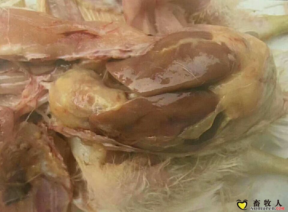 ②肝周炎:肝脏质地变硬,表面有坏死点,有一层黄白色纤维蛋白附着。9 Q/ F7 n6 A- K2 i5 H% d; b3 l