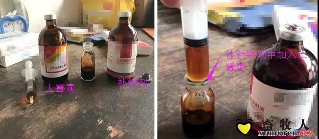 然后,笔者与小伙伴们就在猪场进行抗生素与补铁剂混合测试,观察两种药物混合之后的反应现象。