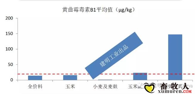 3月份共有66份样品检测了霉菌毒素B1,有份全价料、1份玉米、2份玉米副产品2份花生粕和1份菜籽粕超标,尤其是2份花生粕超标严重。