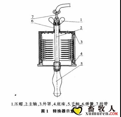 兽用注射针头接换器是由主轴、挂带、外罩、螺母、销钉、放置槽、接换架、记号、手柄、底座、针头、上盖、上盖缺口、弹簧、接换架上端凹凸接触面、环形凹槽等构成,注射用针头可放置在接换架的放置槽内。