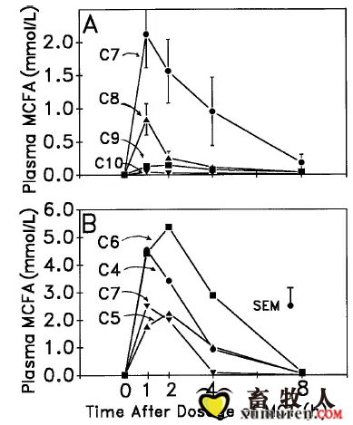 图2:中链甘油三酯(MCT)的脂肪酸组成对仔猪血浆中链脂肪酸(MCFA)浓度的影响。将1日龄仔猪用含有C7至C10((图A,处理n = 7头猪,误差线表示SEM)或C5至C7(B组,每组处理6头猪;SEM适用于所有点)的非乳化MCT油进行胃内插管并开始计时。