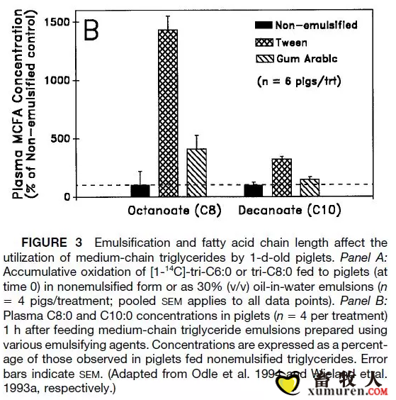图3:乳化和脂肪酸链长度影响1日龄仔猪对中链甘油三酯的利用。图A:以未乳化形式或以30%(v / v)水包油乳剂的14C标记的C6或C8甘油三脂喂食仔猪(0时)(处理4头仔猪;SEM适用于所有点)。图B:饲喂使用各种乳化剂制备的中链甘油三酯乳剂1小时后,小猪血浆中的C8:0和C10:0浓度(每次处理4只)。浓度以喂食未乳化甘油三酯的小猪中观察的百分比表示,误差线表示SEM。(改编自Odle等,1994年或Wieland等,1993a)