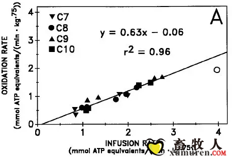 图4:比较仔猪对不同链长的奇数和偶数碳的中链脂肪酸的氧化率。图A:肠外的14C标记的不同类型的脂肪酸以一种非常快的速率注入到仔猪的体内氧化速率。图B:从新生猪分离的肝细胞对14C标记的脂肪酸的体外氧化速率(每次处理4只,误差线以SEM表示)(改编自Odle等人,1992和Odle等人,1991a)