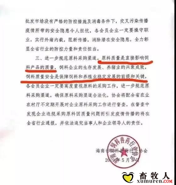 5月5日,海南省饲料兽药行业协会发布了关于饲料原料采购管理的通知,文中指出:饲料原料混装集散物流,进岛原料及运载车辆来自疫区,原料采购人员多来自自配料养殖场或个体违规饲料加工点,在粮油批发市场没有严格的防控措施及消毒条件下,交叉污染传播疫情所带的安全隐患令人担忧;原料质量直接影响饲料产品的质量,饲料质量安全是保证饲料和养殖业稳定发展的前提和关键等。海南省成为继福建尤溪县、江西定南县后又一个全面禁止配料加工的地区。