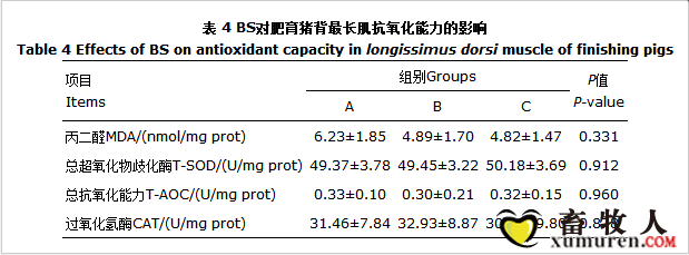 由表 4可知,饲粮中添加BS对肥育猪背最长肌中T-AOC、T-SOD和CAT活性和MDA含量均无显著影响(P>0.05)。