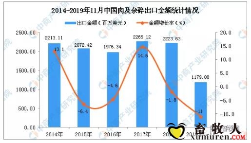从金额方面来看,2019年1-11月中国肉及杂碎出口金额为1179.08百万美元,同比下降11%。