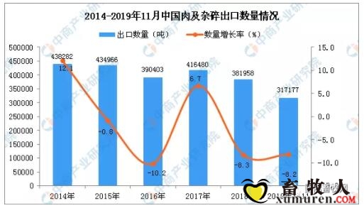 据中商产业研究院数据库显示,2014-2018年中国肉及杂碎出口量有所下降,2019年1-11月中国肉及杂碎出口量为317177吨,同比下降8.2%。