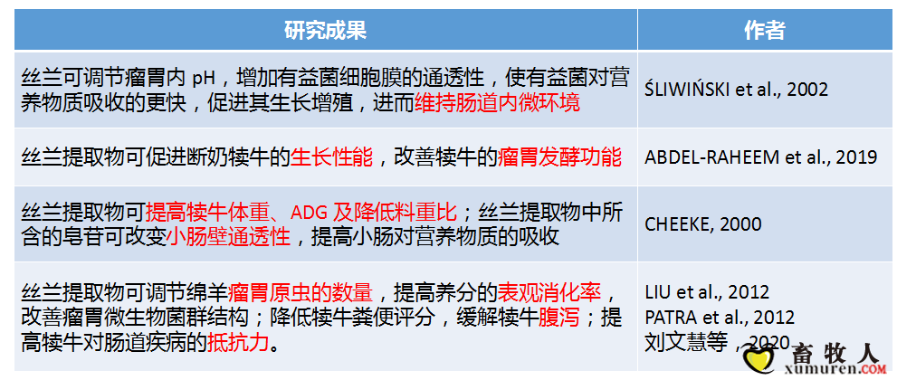 3、丝兰提取物研究进展 大量研究报道,丝兰提取物可提高反刍动物瘤胃内细菌数量及降低原虫数量,可改善动物的瘤胃功能、肠道健康,降低甲烷排放量,提高动物对日粮的消化吸收和生长性能。