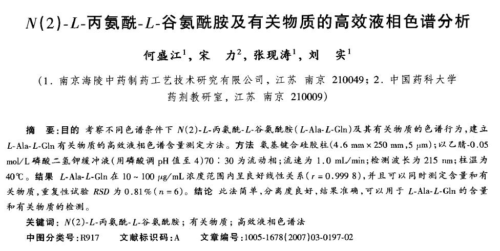 内容介绍:N(2)-L-丙氨酰-L-谷氨酰胺及有关物质的高效液相色谱分析.pdf