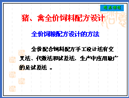 内容介绍:是幻灯片版的,有41张。介绍了全价料配方设计的思路步骤,如何使用原料、举例计算过程和列表,调整方法等。(QQ:852618331 邮箱:852618331@qq.com)