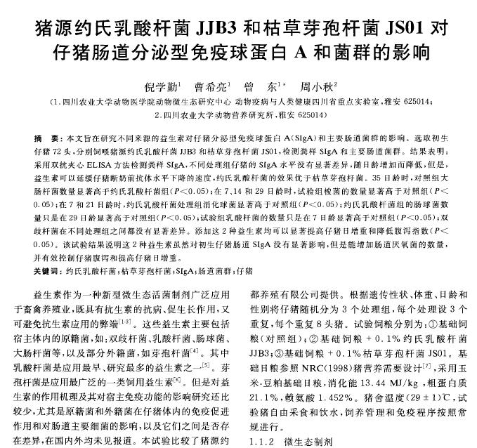 猪源约氏乳酸杆菌JJB3和枯草芽孢杆菌JS01对