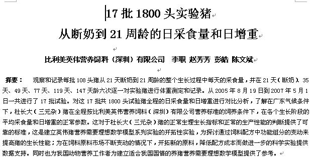 内容介绍:目前国内猪场饲料实验很少有大样本实验数据,现将英伟17批1800头实验猪 从断奶到21周龄的日采食量和日增重,给大家做生产中的参考。很有实际参考价值