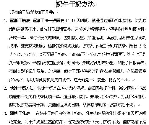 内容介绍:包括:干奶方法.doc 干奶牛程序.doc 干奶牛生理.doc 干奶牛实证方法.doc 泌乳母牛的干奶方法.pdf 奶牛的干乳方法.pdf 奶牛干奶的时间和方法.pdf