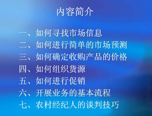 内容介绍:(ppt 59) 一、如何寻找市场信息 二、如何进行简单的市场预测 三、如何确定收购产品的价格 四、如何组织货源 五、如何进行促销 六、开展业务的基本流程 七、农村经纪人的谈判技巧
