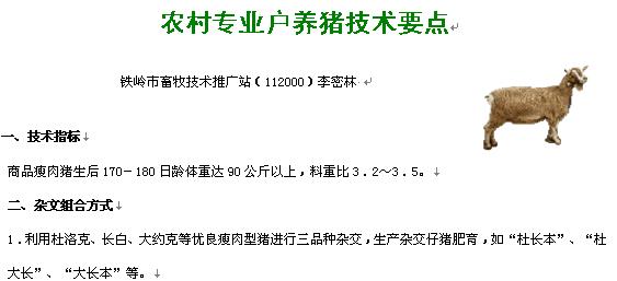 内容介绍:一、技术指标   商品瘦肉猪生后170-180日龄体重达90公斤以上,料重比3.2~3.5。 二、杂文组合方式   1.利用杜洛克、长白、大约克等优良瘦肉型猪进行三品种杂交,生产杂交仔猪肥育,如“杜长本”、“杜大长”、“大长本”等。