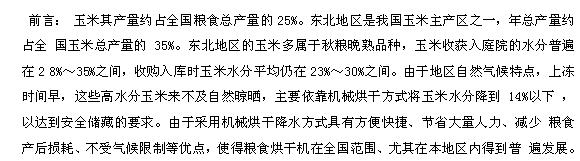内容介绍:前言: 玉米其产量约占全国粮食总产量的25%。东北地区是我国玉米主产区之一,年总产量约占全 国玉米总产量的35%。东北地区的玉米多属于秋粮晚熟品种,玉米收获入庭院的水分普遍在2 8%~35%之间,收购入库时玉米水分平均仍在23%~30%之间。由于地区自然气候特点,上冻 时间早,这些高水分玉米来不及自然晾晒,主要依靠机械烘干方式将玉米水分降到14%以下 ,以达到安全储藏的要求。由于采用机械烘干降水方式具有方便快捷、节省大量人力、减少 粮食产后损耗、不受气候限制等优点,使得粮食烘干机在全国范围、尤其在本地区内得到普 遍发展。据调查统计,东北四省区现有各式粮食干燥机约2 000台,我们利用两个月的时间 对 东北四省区粮食烘干的现状进行实地考察,并对烘后粮食品质质量指标进行测定分析。通过 详细调查和测定分析,我们发现目前这些粮食烘干机在生产应用中不同程度地存在着一些问 题,如烘干机性能较差、烘后粮食品质下降等问题。对此,我们根据我国粮食烘干长远发展 的需要,提出从以数量为主向以质量为主转变,具体看法与建议如下。
