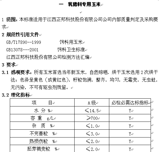 内容介绍:江西正邦集团乳猪饲料原料收货标准
