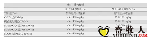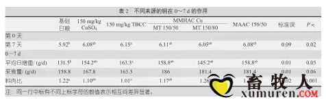 近期的一项饲喂试验给出了进一步证实。对924 头刚断奶仔猪的生产性能进行比较,它们饲喂无机源的铜添加剂CuSO4 和碱式氯化铜(Tribasic Copper Chloride,TBCC),或按二种添加率添加的有机源添加剂 MMHAC。试验猪断奶后的前21 d 饲喂的铜水平相同。对照组铜元素仅来自饲料组分和微量矿物质预混料中的铜( 表1)。