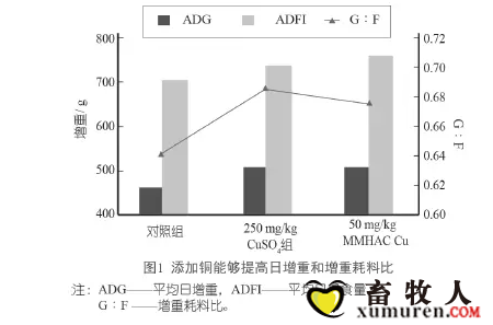Ma 及其同事对美国已发表的在保育猪和生长- 育肥猪日粮中添加铜元素的文献进行了综合分析,其中6 项是研究不同添加水平的铜元素所产生的效应。结果表明,与无机硫酸铜相比,给保育猪日粮中添加有机螯合铜源[ 金属蛋氨酸羟基类似物螯合铜(Metal Methionine Hydroxy Analogue Copper Chelate,MMHAC Cu)]能使保育猪的日增重(Average Daily Gain,ADG) 显著提高3 %,饲料转化率(Feed Conversion Ratio,FCR) 显著提高2.6 %。饲喂MMHAC Cu 的断奶仔猪腹泻发生率下降了23 %,饲喂MMHAC 制剂能提高生长育肥猪的免疫反应和对玉米- 大豆型日粮营养物质的消化率。