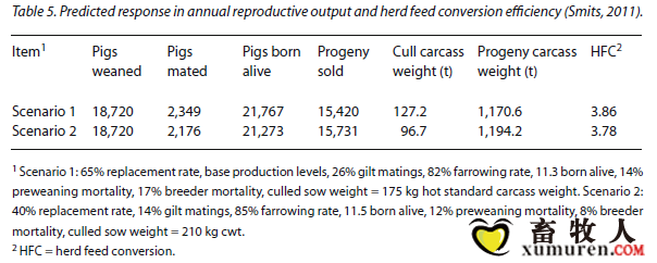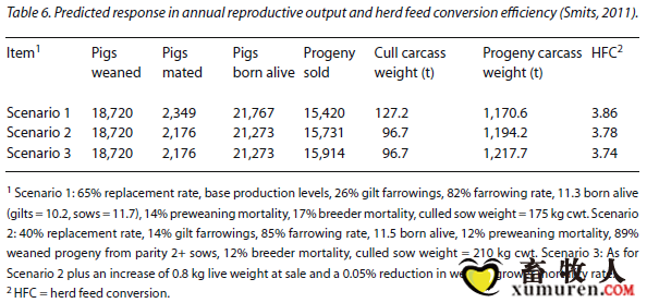 既然后备母猪存在如此问题,Smits(2011)年研究显示降低母猪淘汰率,可改善整个猪群的饲料效率,结果见下表5。方案1中母猪的淘汰率为65%,后备母猪的配种率为26%。方案2中母猪的淘汰率为40%,后备母猪的配种率为14%。两种方案所产断奶仔猪数一样,方案2降低母猪淘汰率,提高了产活仔猪数、上市胴体重,最终使料重比降低了2.1%。如果进一步考虑降低母猪淘汰率,还间接降低了后备母猪所产后代的数量,提高了经产母猪所产后代数量。那可使整个猪群的饲料效率提高3%,具体见下表6。