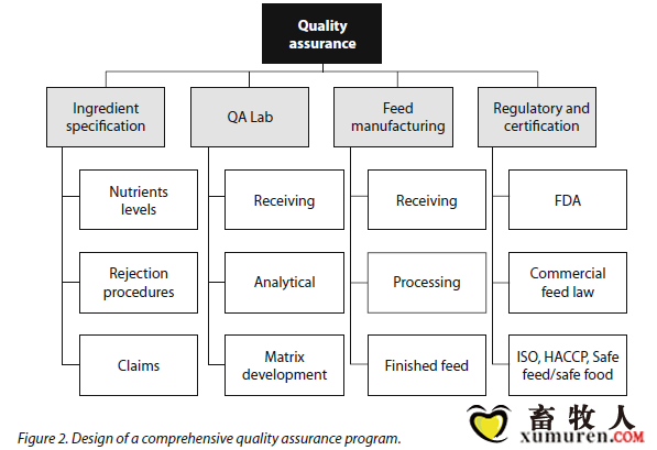 养猪生产者必须拥有制定一个全面的饲料质量保证计划(如下图2),包括购买原料、饲料加工和运输必须遵循的政策和程序。饲料购买者也须注意饲料加工厂的质量保证计划。一份饲料质量保证计划所包括的细节和内容必须建立在饲料加工厂的目标基础之上,且制定时应与加工厂的设备和加工程序相匹配。饲料质量保证计划还必须明确原料的质量规范、加工工艺、包装、运输,及在销售或运输过程中符合公司规定的营养和物理特性等质量要求的成品饲料的关键控制点。另外根据监管要求,饲料质量保证计划还必须得到第三方的认证项目,如PQA、HACCP、ISO、Safe Feed/Safe Food。一份全面的饲料质量保证计划将包含以下这些:员工培训、原料规范和跟踪、质量保证手册、标准化操作流程、关键控制点、采样及分析安排、报表系统、审核过程。