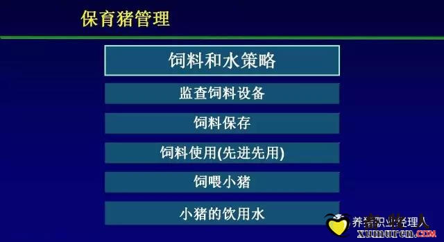 饲料和饮水策略:监查饲料设备、饲料的保存、饲料使用原则、饲喂小猪及饮用水的管理