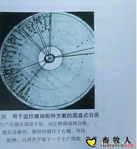 2.图2-35显示了一个批次生产的猪场实例,该场的生产按照累计目标进行监测。如果该批次管理系统存在严重的问题,这种方法能使人们有机会对系统进行调整并及时补救。很多猪场的错误是依赖平均值。进行批次生产时,该数量必须包含全部的猪,且每批次的猪群数必须相同。例如图3-35每批次总配种数是11.1头,而事实上总配种数将会是12头。 3.对于母猪数少于350头的小猪场,圆盘日历能够提供一个高效且简洁的可视化管理方法(图3-36)。将要淘汰的母猪可利用有色编码进行标识。在这种特别的猪场中,夏季繁殖障碍是一种常见的现象,需增加配种数以填补母猪将被淘汰留下的空缺。