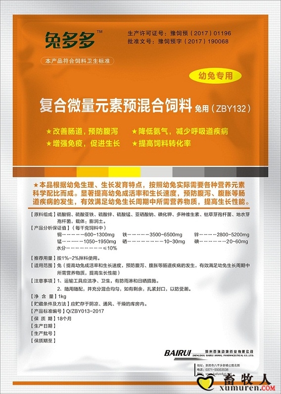 兔多多2%种兔预混料主要特点: 1、增进食欲,促进营养吸收。 2、预防腹胀、腹泻等肠道疾病发生。 3、降低兔舍氨气,减少种兔呼吸道疾病发生。 4、对母兔产后乳房炎,幼兔黄尿病有显著预防作用。5、均衡种兔体质,促进发情,增强繁殖性能。 6、降低因注射疫苗、运输、天气等造成的应激反应。7、全面补充营养,有效预防因营养缺乏造成的咬毛、吃毛、瘫痪等情况的发生。 8、无抗生素添加,适合长期发展使用。 兔多多兔预混料详细说明: