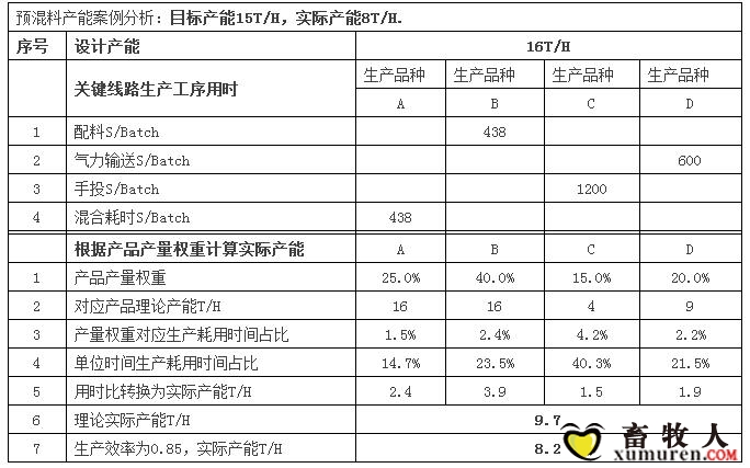 为什么设计产能不能最终转化为实际产能,但因为目前大多数预混料企业及设计单位在产能设计阶段,仅以不同配方的配料时间为准来设计产能,这样的设计思路缺失了对不同产品的生产用时,不同产品的产量权重,不同产品的生产耗时占比,以及产线的生产效率等影响实际产能的重要因素的考量和计算,最终造成的结果是实际产能小于或大于设计产能,也就小于或大于目标产能。