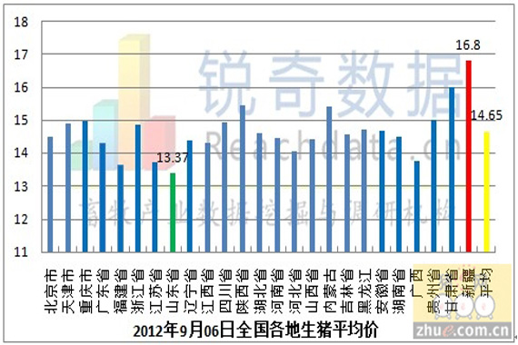 9月6日生猪市场行情较昨日震荡上扬,全国生猪价格最高地区为新疆,生猪平均价为16.8元/千克,最低地区为山东省,生猪平均价为13.37元/千克,两地区差异非常明显,全国大部分地区生猪行情震荡调整。