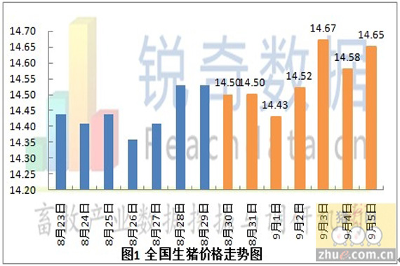 据锐奇数据监测的当地生猪报价信息统计,2012年9月6日全国各省生猪平均价格为14.65元/千克,较昨日(9月5日)上涨0.07元/千克,上涨幅度为0.48%,较上周同期(8月30日)上涨0.12元/千克,上涨幅度为0.82%。(见图1)今日猪粮比为5.77:1,较昨日上涨0.06,涨幅为1.05%。较上周同期(8月30日)上涨0.05,涨幅为0.87%。(见图2)