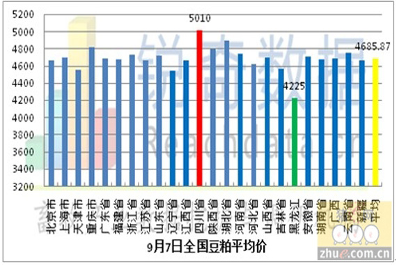据锐奇数据检测当地豆粕报价信息统计,2012年9月07日国内各地豆粕平均价格为4685.87元/吨,较昨日(9月6日)4716.1元/吨下跌30.23元/吨,跌幅为0.64%。 据此次检测的省市中,最高价格四川省为5010元/吨,最低价格黑龙江省4225元/吨.