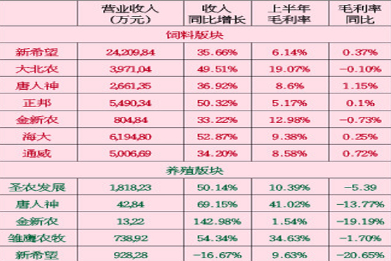 也有部分人士认为,虽然饲料上市企业的半年报还算“看得过去”,但总体来看,大多饲料企业来说并不好过。南方农村报记者整理发现,农牧企业饲料版块上半年毛利率同比增长普遍在1%以下。