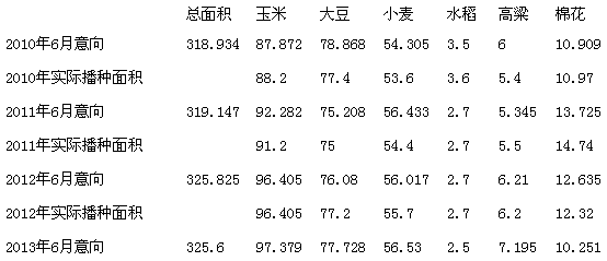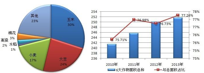 图:2013年美国主要作物面积占比: 表:近4年主要作物种植面积与总面积占比